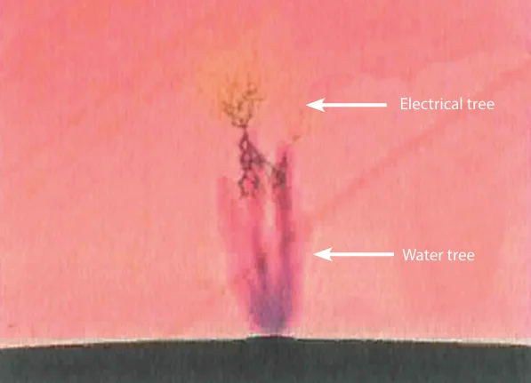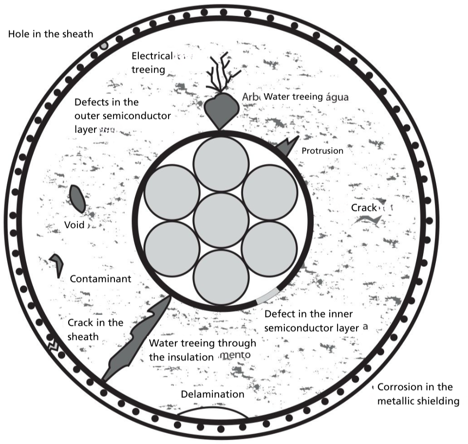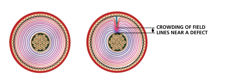 The figures below illustrate how the distortion of electric field lines favors the emergence of discharges which, over time, reduce dielectric strength until causing cable failure.