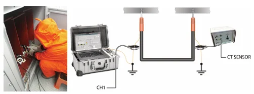 These are performed with the system energized, using high-frequency current transducers connected to the cable shield, as shown in the figure below: