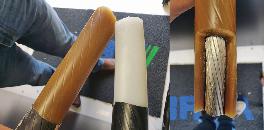 After ruling out the previous causes, attention shifted to the hypothesis of thermal failures. A comparison between in-service cable samples and new cables revealed significant darkening of the insulation, indicating early thermal degradation. This visual difference is shown in Figure 2, where the dark tone of the operating cable stands in stark contrast to the light color of the new cable, indicating exposure to elevated temperatures, possibly exceeding the continuous operating limit.
